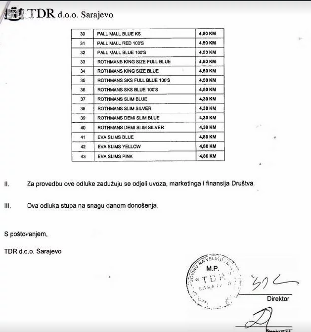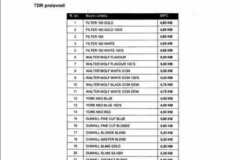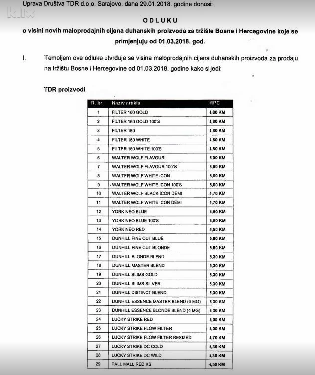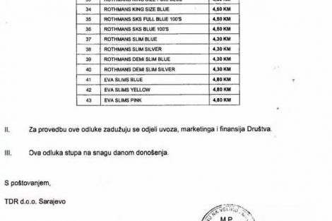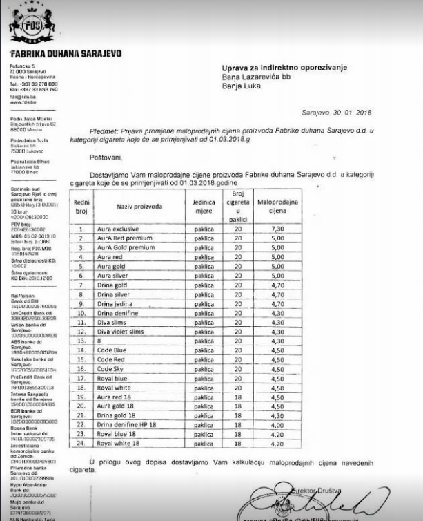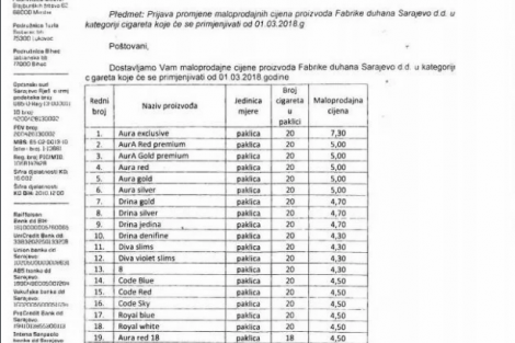 “Kompanije TDR d.o.o. Sarajevo i Fabrika duhana Sarajevo dostavile su UIO nove maloprodajne cijene cigareta koje će biti u primjeni od 1. marta 2018. godine. Prema dostavljenim kalkulacijama novih maloprodajnih cijena cigarete će poskupjeti uglavnom za 0,10 KM po paklici, dok će samo nekoliko vrsta cigareta poskupjeti za 0,20 KM po paklici”, potvrđeno je za Klix.ba iz Uprave za indirektno oporezivanje BiH.