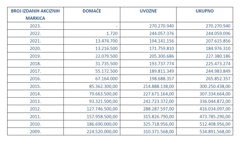 Prema tabeli izdanih akciznih markica koju su nam ustupili na uvid, može se primijetiti da se ukupan broj izdanih akciznih markica od 2009. do 2023. godine, dvostruko umanjio, i to bez značajnog smanjenja broja pušača u BiH.