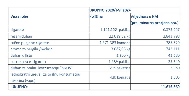 Pa tako, u ustupljenom tabelarnom pregledu, od 2020. pa do kraja prve polovice 2024. godine, vidimo da je ukupna vrijednost oduzetog duhana i duhanskih prerađevina 11.616.869 KM.