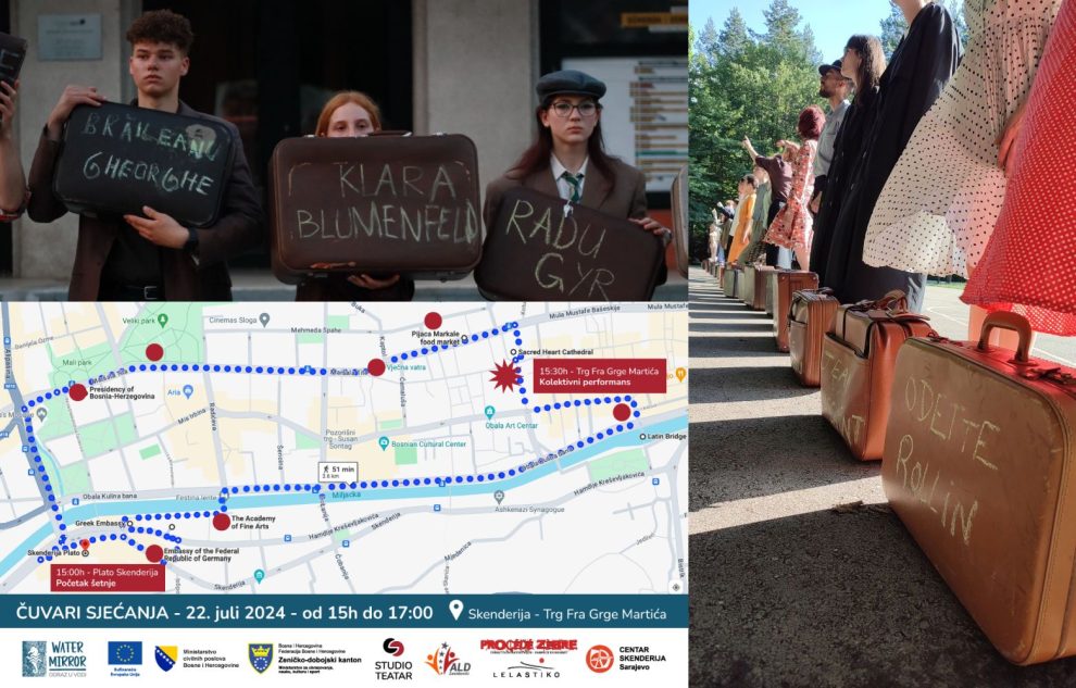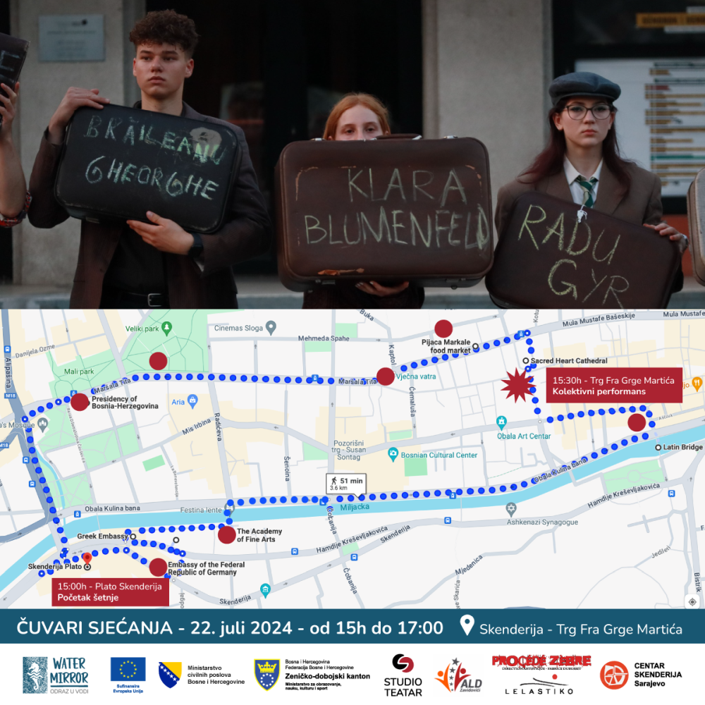 Ne trebate biti umjetnik ili imati posebno iskustvo – sve što je potrebno je komad odjeće koji vas podsjeća na prošla vremena, jedan stari kofer, i srce puno želje da odate počast osobi koja vas je inspirisala svojom borbom za istinu, pravdu, slobodu, umjetnost ili neko drugo plemenito uvjerenje. Šetnja će u 15:00 h krenuti sa platoa ispred Skenderije, prateći rutu koja spaja ključne historijske lokacije koje su duboko utkane u identitet Sarajeva. U 15:30 h, na Trgu Fra Grge Martića, ispred Katedrale, umjetnička trupa će se zaustaviti i izvesti pozorišno-muzički program koji će nas sve povezati kroz emociju i umjetnost. Šetnja završava tamo gdje je i počela – na platou ispred Skenderije, simbolično zatvarajući krug sjećanja i zajedništva.