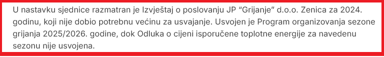 Tada na scenu stupa gradonačelnik Kasumović sa tvrdnjom da je odluka o povećanju cijene usvojena, jer su vijećnici većinom glasova podržali prethodnu tačku dnevnog reda koja glasi „Program organizovanja sezone grijanja 2025/26“, unutar koje je su pod stavkom „Planske cijene“ navedene povećane tarife usluga grijanja!?