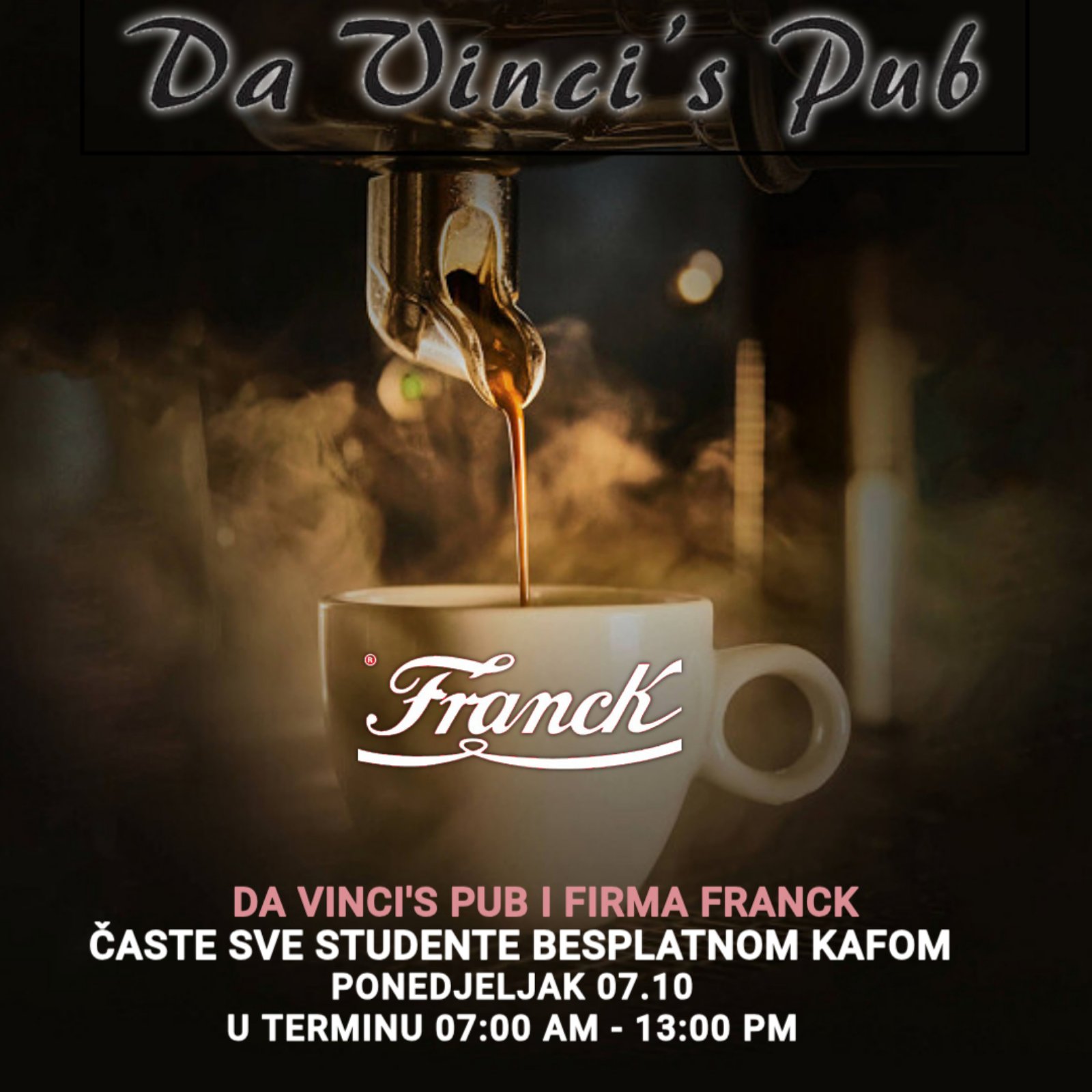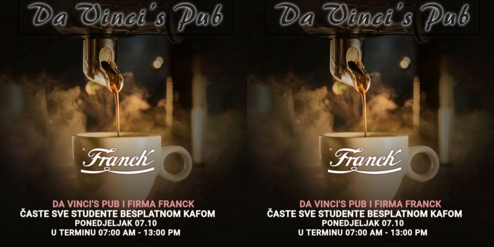 U organizaciji Da Vinci’s Puba i kompanije Franck svi studenti će u ponedjeljak, 7. oktobra, imati besplatnu kafu u Da Vinci’s Pubu Zenica!