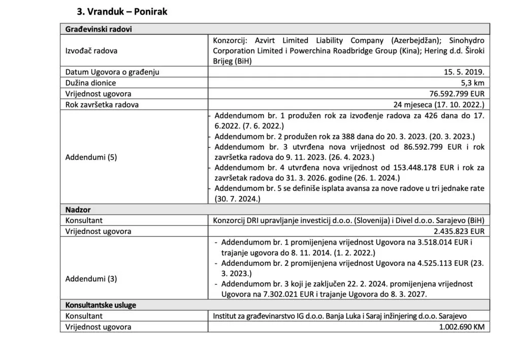 Podsjećamo, osnovni ugovor za dionicu Vranduk–Ponirak potpisan je 15. maja 2019. godine, sa početnom vrijednošću od 76,6 miliona eura i rokom završetka od 24 mjeseca. Nakon više produženja, tzv. addendum br. 3, potpisan 26. aprila 2023. godine, utvrdio je novu vrijednost ugovora od 86.592.799 eura, a rok završetka radova: 9. novembar 2023. Izvori Fokusa upućeni u projekat izgradnje ove dionice kazali su na da je ovaj addendum predstavljao funkcionalno rješenje odnosno da su radovi mogli biti završeni u tom okviru.