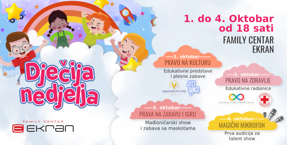 Draga djeco i dragi roditelji, povodom obilježavanja dječije nedjelje, organizujemo ČETIRI dana edukativnih, zabavnih i kreativnih radionica u našoj rođendaonici u Family centru Ekran.