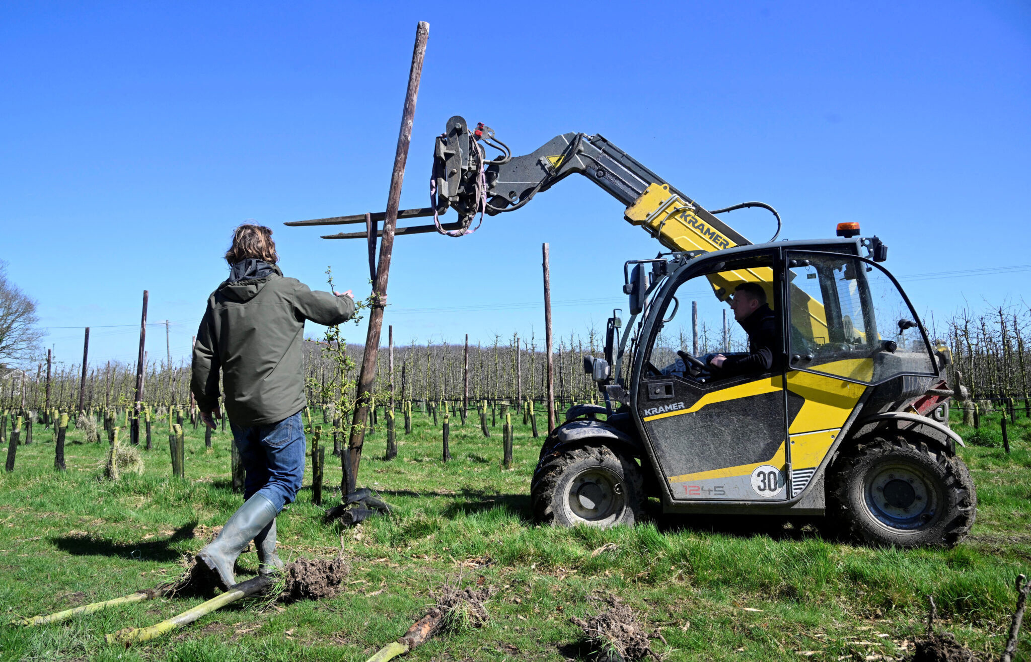 Workers uproot apple trees in an orchard as they move away from apple growing at Loddington Farm near Maidstone in southern Britain, April 3, 2023. REUTERS/Toby Melville