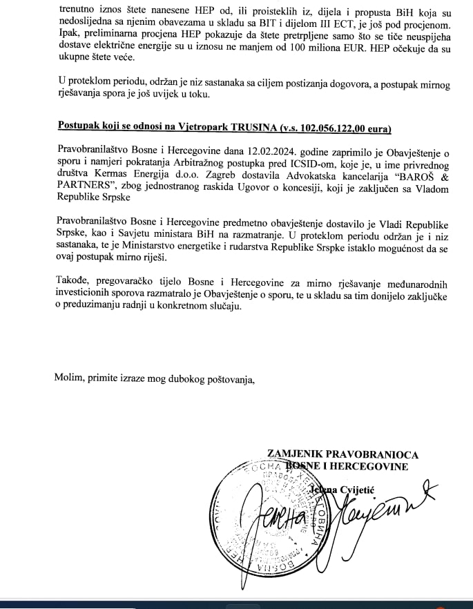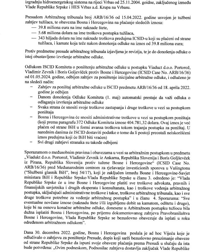 Arbitražni postupak po tužbi Elektrogospodarstva Slovenije protiv BiH vodi se pred ICSID-om u Washingtonu, pod oznakom ARB/14/13, a vrijednost spora iznosi 695.175.000 eura.