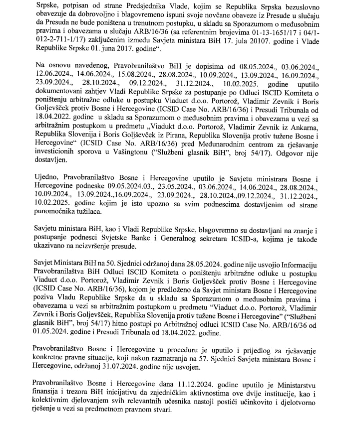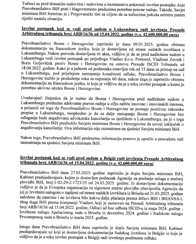 “Tužioci su pred domaćim i međunarodnim sudovima pokrenuli izvršne postupke, a BHANSA već trpi posljedice zapljene sredstava”, navedeno je, između ostalog, pri čemu se misli na posljedice zbog arbitraže Viaduct koja je u toku i za čiju isplatu nije još pronađeno rješenje.
