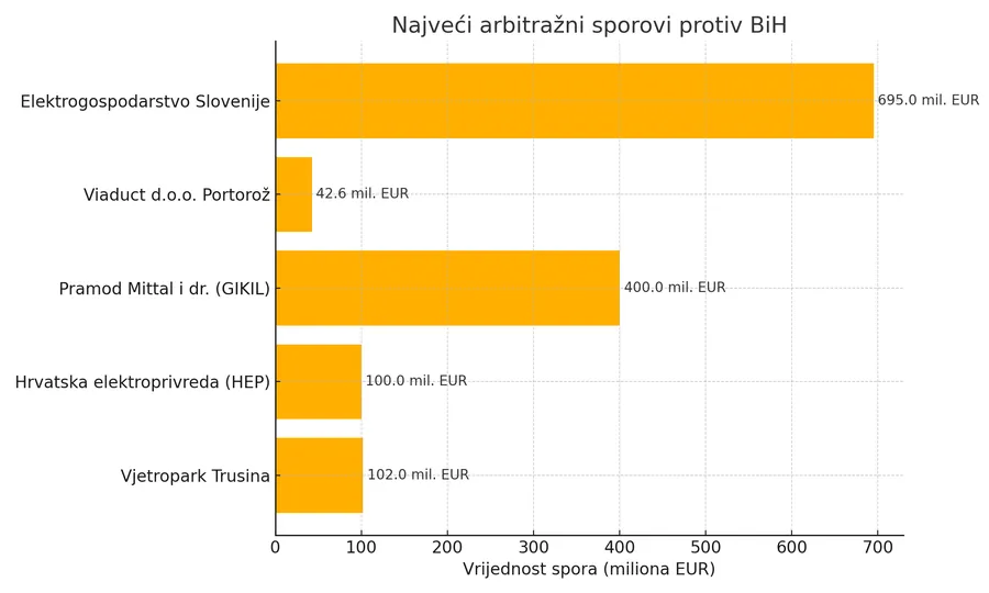 Vrijednost navedenih sporova je izražena u milionima eura. Elektrogospodarstvo Slovenije prednjači sa čak 695 miliiona eura, dok su sporovi s Viaductom, Mittalom, HEP-om i Trusinom također višemilionski i ozbiljno prijete javnim finansijama BiH.