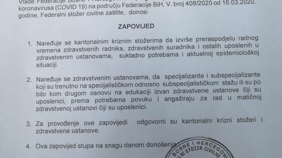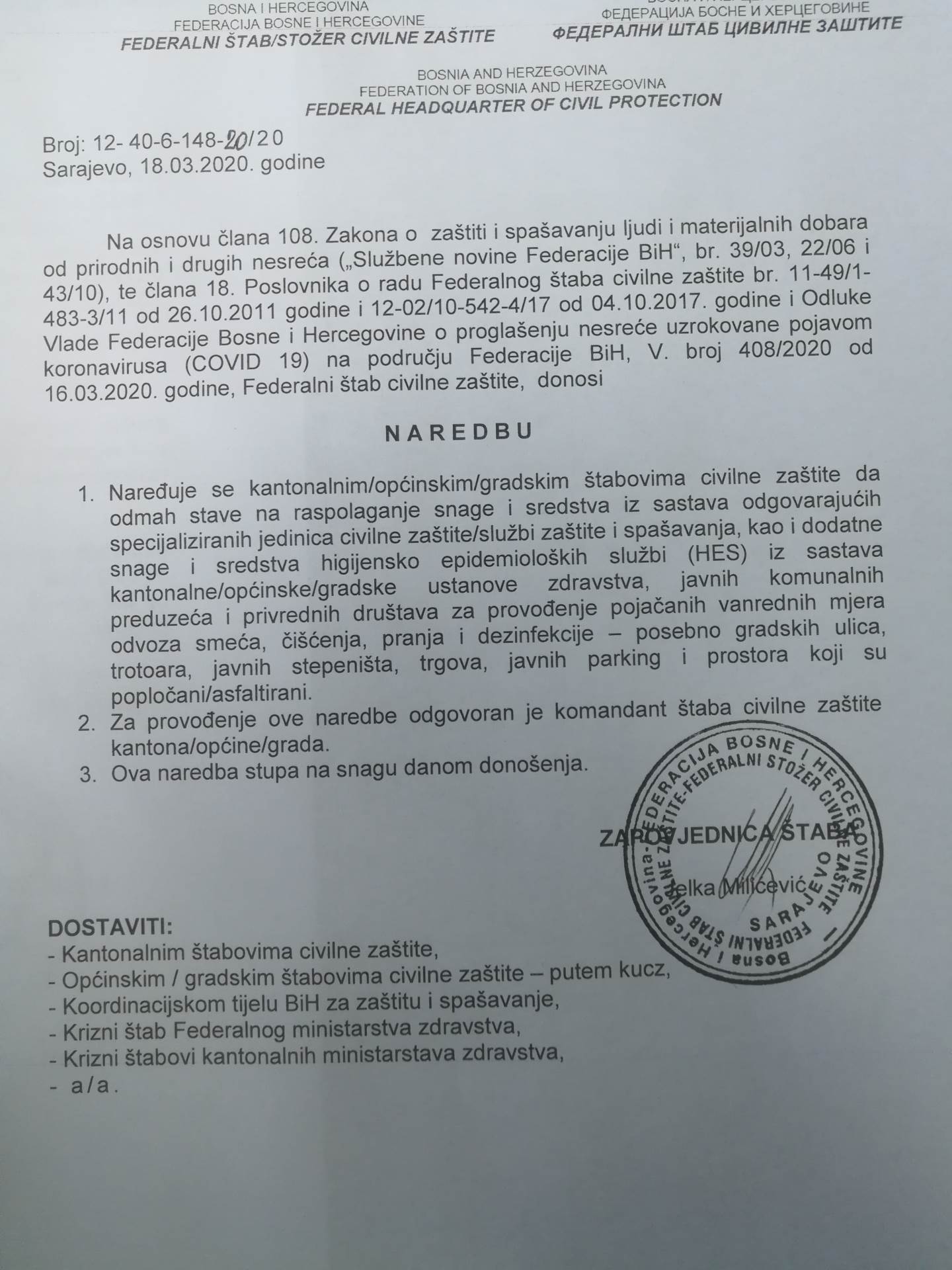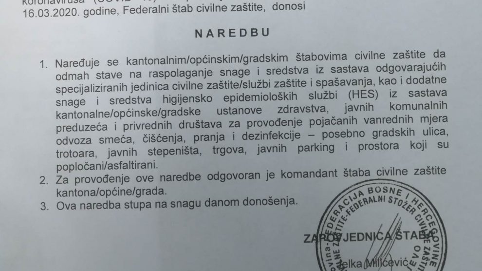 Federalni štab civilne zaštite donio je u utorak 16 naredbi kojima se nalaže lokalnim samoupravama, kantonalnim upravama, privrednim društvima, fizičkim i pravnim licima i građanima mjere postupanja u skladu sa Odlukom o proglašenju stanja nesreće uzrokovane pojavom korona virusa (COVID – 19) na području FBiH koju je na tematskoj sjednici u proširenom sastavu, na prijedlog Federalnog štaba civilne zaštite (FŠCZ), donijela Vlada Federacije BiH.