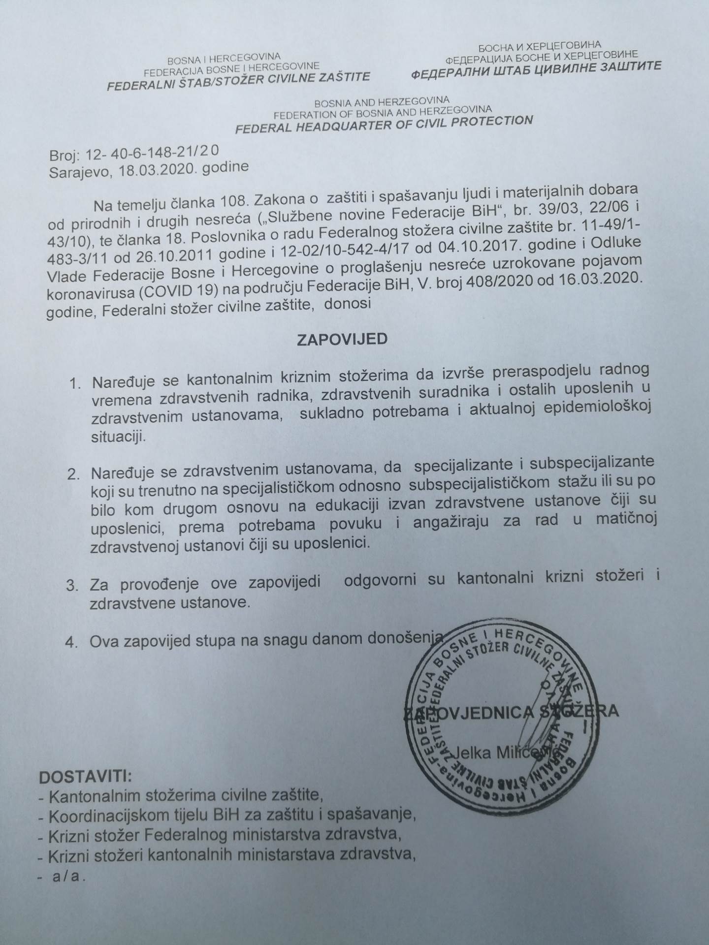 Danas je Federalni štab civilne zaštite ponovo zasjedao te je donio nove dvije naredbe.