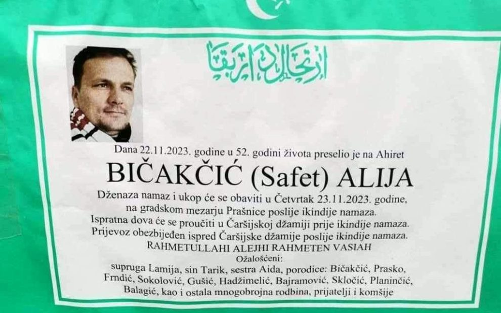 Dženaza i ukop Alije (Safeta) Bičakčića, profesora i bivšeg direktora Osnovne Muzičke škole u Zenici, biće danas poslijepodne u Zenici. On je preminuo jučer poslijepodne nakon višemjesečne bolesti. Iza Alije su ostali supruga Lamija i sin Tarik.