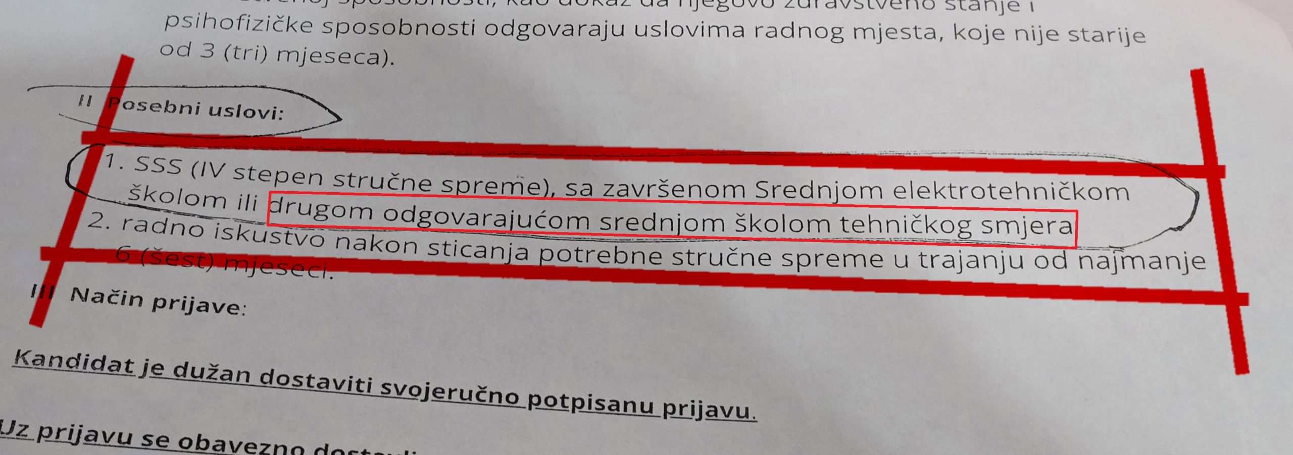 U Direkciji se skoro na glas “šale” da je dobro da su dobili “mašinca”, jer su po ovom Konkursu (iako su svi ostali prijavljeni bili elektro struke) mogli dobiti i Poljoprivrednog ili Šumarskog tehničara!