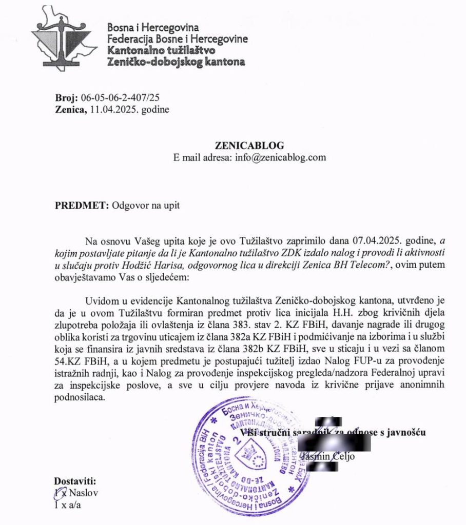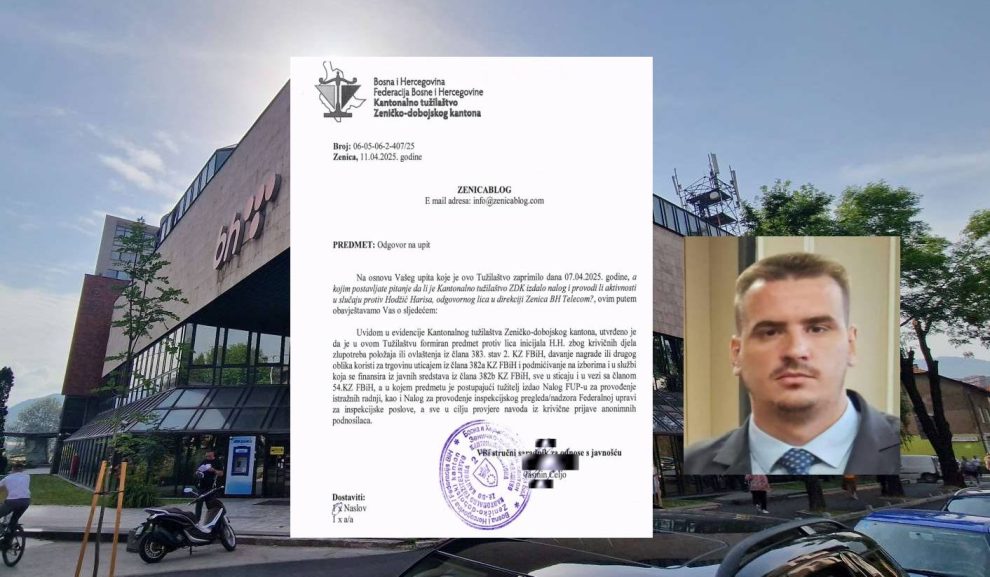 U Tužilaštvu ZDK su bili “rječitiji” – Na osnovu Vašeg upita koje je ovo Tužilaštvo zaprimilo dana 07.04.2025. godine, a kojim postavljate pitanje da li je Kantonalno tužilaštvo ZDK izdalo nalog i provodi li aktivnosti u slučaju protiv Harisa Hodžića, odgovornog lica u direkciji Zenica BH Telecom, ovim putem obavještavamo Vas o sljedećem: