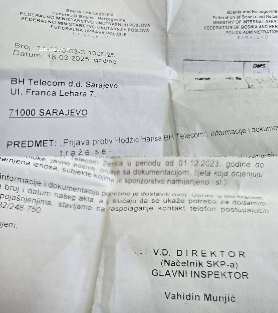 Prema dokumentu u koji je Zenicablog imao uvid, vršilac dužnosti direktora i Načelnik sektora kriminalističke policije Federalne Uprave Policije (FUP) glavni inspektor Vahidin munjić uputio je dopis čelnicima BH Telecoma, u kojem je na dvije stranice zatražio originalne ili ovjerene kopije niza od desetina dokumenata, radi provođenja istražnih radnji, a po zahtjevu Tužilaštva.