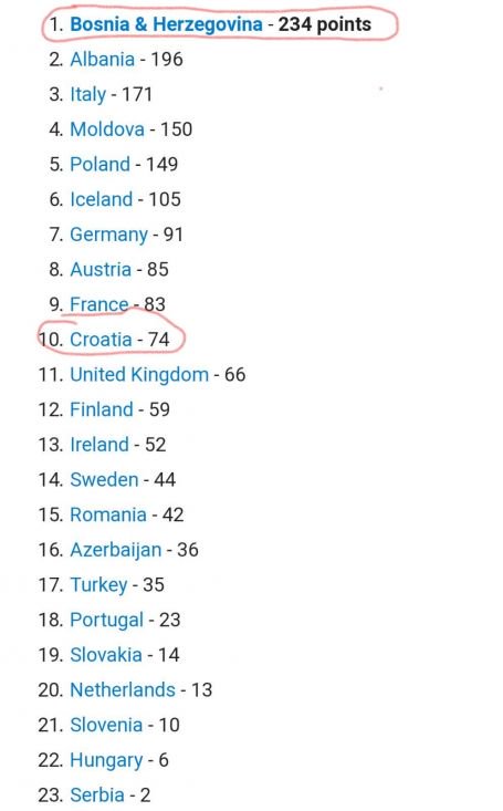 Od ukupno 23 zemlje, naši susjedi Slovenci su u ukupnom poretku na 21. mjestu, a Srbi na posljednjem s tek 2 boda.