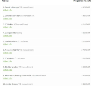 Najplaćenija pozicija u BiH je definitivno menadžer ili direktor (najviši menadžment), s prosjećnom plaćom od 4.974 KM. Glavni izvršni direktor zarađuje u prosjeku 4.429 KM, dok IT direktor 4.125 KM. Direktor u sektoru lizinga ima prosječnu plaću od 4.052 KM, a vodeći programer u oblasti informacionih tehnologija zarađuje 3.775 KM.