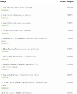 S druge strane, najlošije plaćene pozicije u Bosni i Hercegovini imaju prosječne plaće koje se kreću od 665 KM do 943 KM.