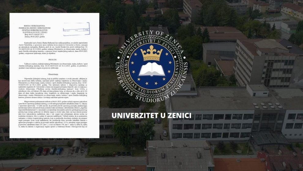 Kantonalni sud u Zenici donio je presudu kojom se poništava rješenje Ministarstva za obrazovanje, nauku, kulturu i sport Zeničko-dobojskog kantona (ZDK), koje se odnosilo na provođenje inspekcijskog nadzora u slučaju izbora rektora Univerziteta u Zenici.