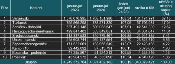 Za sedam mjeseci 2024. godine naplaćeno je 288 miliona KM, odnosno 14 posto više u odnosu na isti period 2023. godine, dok u odnosu na isti period 2022. godine taj rast iznosi čak 585 miliona KM, odnosno 33 posto.