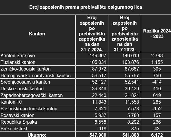 Broj zaposlenih prema prebivalištu zaposlenika na dan 31.7.2024. godine je 547.980. U odnosu na objavljeni podatak o broju zaposlenih na dan 31.7.2023. godine kada je broj zaposlenih iznosio 541.808, ovaj broj je veći za 6.172, a u odnosu na prethodno objavljeni podatak o broju zaposlenih na dan 30.6.2024. godine kada je iznosio 549.119, manji je za 1.139.