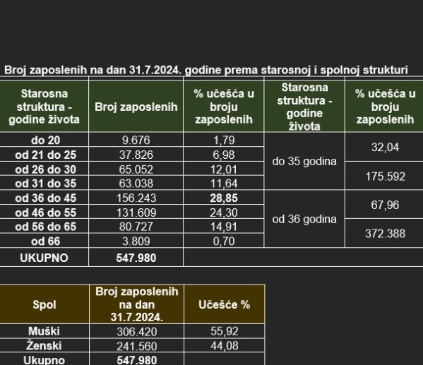 Broj zaposlenih do 35 godine je 175.592, ili 32,04%, a broj zaposlenih koji je stariji od 36 godina je 372.388 ili 67,96%. Na dan 31.7.2024. godine u Federaciji BiH zaposleno je 306.420 ili 55,92%, muškaraca i 241.560 žena ili 44,08%. Broj zaposlenih do 35 godine je 175.592, ili 32,04%, a broj zaposlenih koji je stariji od 36 godina je 372.388 ili 67,96%.