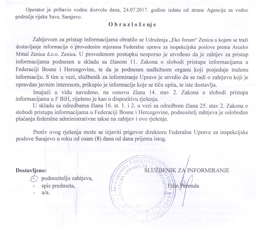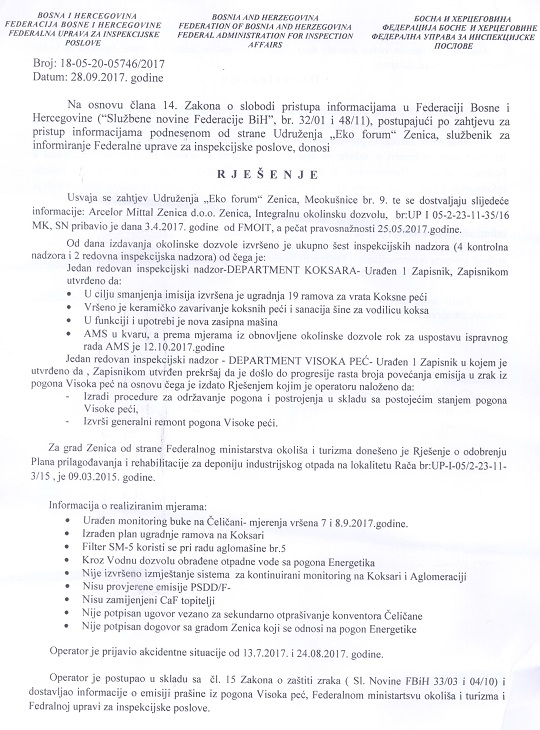 Federalna inspekcija za šest mjeseci nije naplatila niti jednu kaznu, a mjere iz okolinske dozvole se ne provode, zaključuje Eko forum u današnjem saopštenju za javnost. Federalno ministarstvo okoliša i turizma je 3.4.2017. godine izdalo novu okolinsku dozvolu za pogone i postrojenja kompanije ArcelorMittal Zenica. Za kontrolu sprovođenja mjera iz te dozvole zadužena je Federalna uprava za inspekcijske poslove. Na osnovu odredbi Zakona o slobodi pristupa informacijama BiH (Sl. glasnik BiH 28/00, 45/06), Eko forum Zenica je od Uprave tražio da nam dostavi informacije o sljedećem: