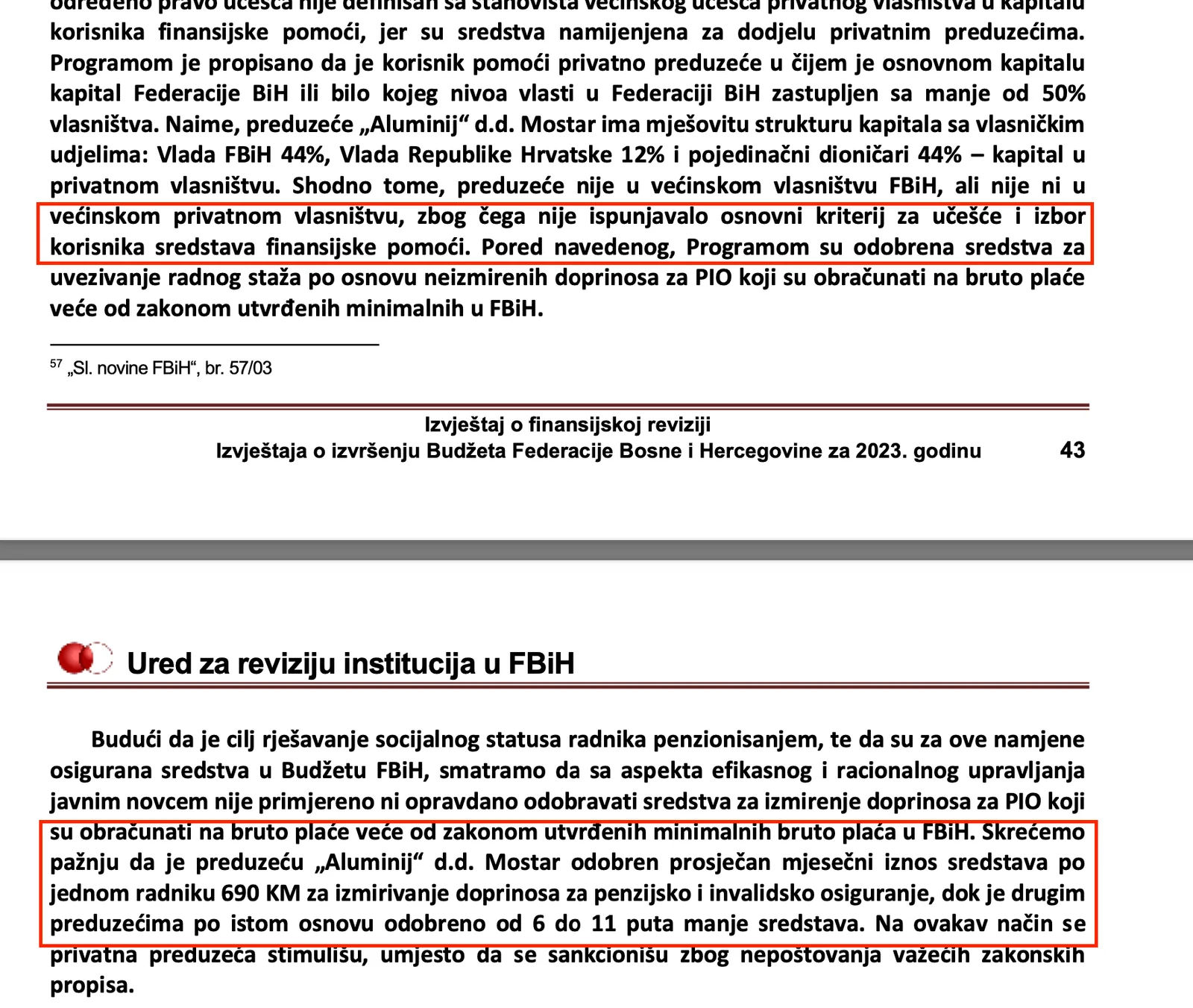 “Programom je propisano da je korisnik pomoći privatno preduzeće u čijem je osnovnom kapitalu kapital Federacije BiH ili bilo kojeg nivoa vlasti u Federaciji BiH zastupljen sa manje od 50% vlasništva. Naime, preduzeće „Aluminij“ d.d. Mostar ima mješovitu strukturu kapitala sa vlasničkim udjelima: Vlada FBiH 44%, Vlada Republike Hrvatske 12% i pojedinačni dioničari 44% – kapital u privatnom vlasništvu. Shodno tome, preduzeće nije u većinskom vlasništvu FBiH, ali nije ni u većinskom privatnom vlasništvu, zbog čega nije ispunjavalo osnovni kriterij za učešće i izbor korisnika sredstava finansijske pomoći. Pored navedenog, Programom su odobrena sredstva za uvezivanje radnog staža po osnovu neizmirenih doprinosa za PIO koji su obračunati na bruto plaće veće od zakonom utvrđenih minimalnih u FBiH”, naveli su revizori.