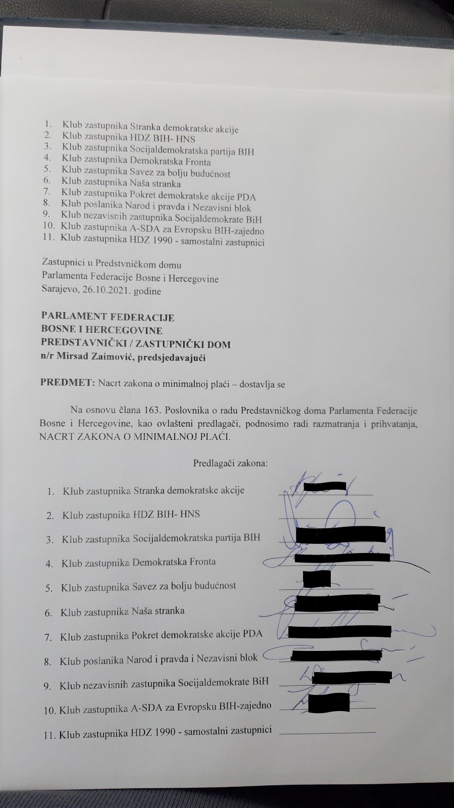 Danas je u Parlamant Federacije BiH dostavljen Nacrt zakona o minimalnoj plaći koji su na inicijativu Saveza samostalnih sindikata Bosne i Hercegovine, kao ovlašteni dostavljači, usaglasili predstavnici devet klubova zastupnika u Zastupničkom domu Parlamenta Federacije BiH (u prilogu).