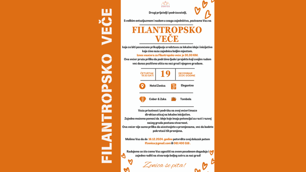U cilju pružanja podrške lokalnim idejama i inicijativama, Lokalna fondacija Zenica sa ponosom najavljuje organizaciju događaja „Filantropsko veče – Zenica se pita!“, koje će se održati u četvrtak, 19.12.2024. godine od 19:30 sati u Hotelu “Zenica” u Zenici. Ovaj događaj ima za cilj da okupi zajednicu, donatore, preduzetnike i sve ljude dobre volje kako bi prikupili sredstva za podršku projektima koji imaju pozitivne efekte na našu lokalnu zajednicu.