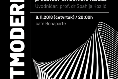 Tema sinoćnjeg javnog predavanja bila je postmoderna a o njoj je govorio dr. sc. Bernard Harbaš, doktor filozofskih nauka zaposlen na Univerzitetu u Zenici. Budući da se radi o izrazito kompleksnom pitanju i svojevrsnoj neuhvatljivosti općenitog razumijevanja postmoderne, dr. Harbaš je u svom izlaganju napravio propedeutički osvrt na temeljna polazišta moderne, posebice iz ugla filozofije Karla Marxa, Johna Lockea, Immanuela Kanta i Friedricha Nietzschea.