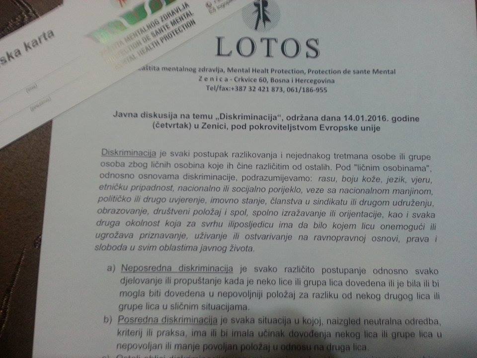 Foto: Diskusija o diskriminaciji – Udruženje „Lotos“ je organizovalo javnu diskusiju na temu „Diskriminacija sa osvrtom na diskriminaciju nacionalnih manjina“. Ovom prilikom su predstavnici različitih organizacija javno diskutovali o primjerima diskriminacije sa kojima se susreću kako kroz svoj rad tako i iz ličnih iskustava, a sa ciljem što boljeg razumijevanja i zajedničkog djelovanja radi zaštite od diskriminacije.