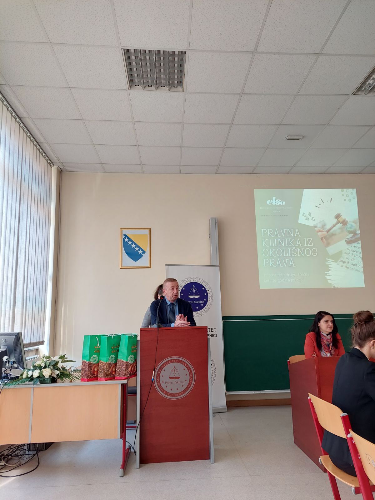 U uvodnom dijelu svečanosti prisutnima se obratio prof. dr. sc. Enes Bikić, prorektor za nastavu i studentska pitanja Univerziteta u Zenici, potom prof. dr. sc. Aida Mulalić, prodekanesa za nastavu i studentska pitanja Pravnog fakulteta Univerziteta u Zenici, zatim studentica četvrte godine Pravnog fakulteta u Zenici Aida Rihić, predsjednica ELSA Zenica, i mr. iur. Lejla Zilić-Čurić, viša asistentica na Pravnom fakultetu i voditeljica projekta Pravna klinika iz okolišnog prava. U uvodnom obraćanju istaknut je značaj pravničkog kliničkog obrazovanja u oblasti okolišnog prava.