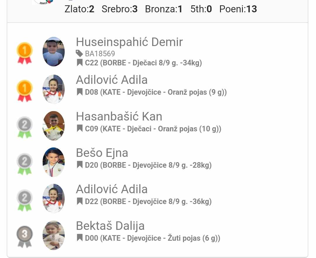 Naša takmičarka Dalija Bektaš je osvojila ZLATNI PEHAR kao najmlađa takmičarka turnira, dok je naša Adila Adilović zauzela prvo mjesto u ukupnom poretku u neslužbenim kategorijama.