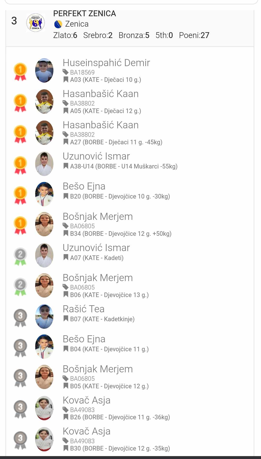 Brončanim medaljama okitili su se Tea Rašić u katama za kadetkinje, Ejna Bešo u katama za djevojčice do 11 godina, Merjem Bošnjak u katama za djevojčice do 12 godina, te Asja Kovač koja je osvojila dvije brončane medalje u borbama za djevojčice u kategorijama do 11 godina -36 kg i do 12 godina -35 kg.