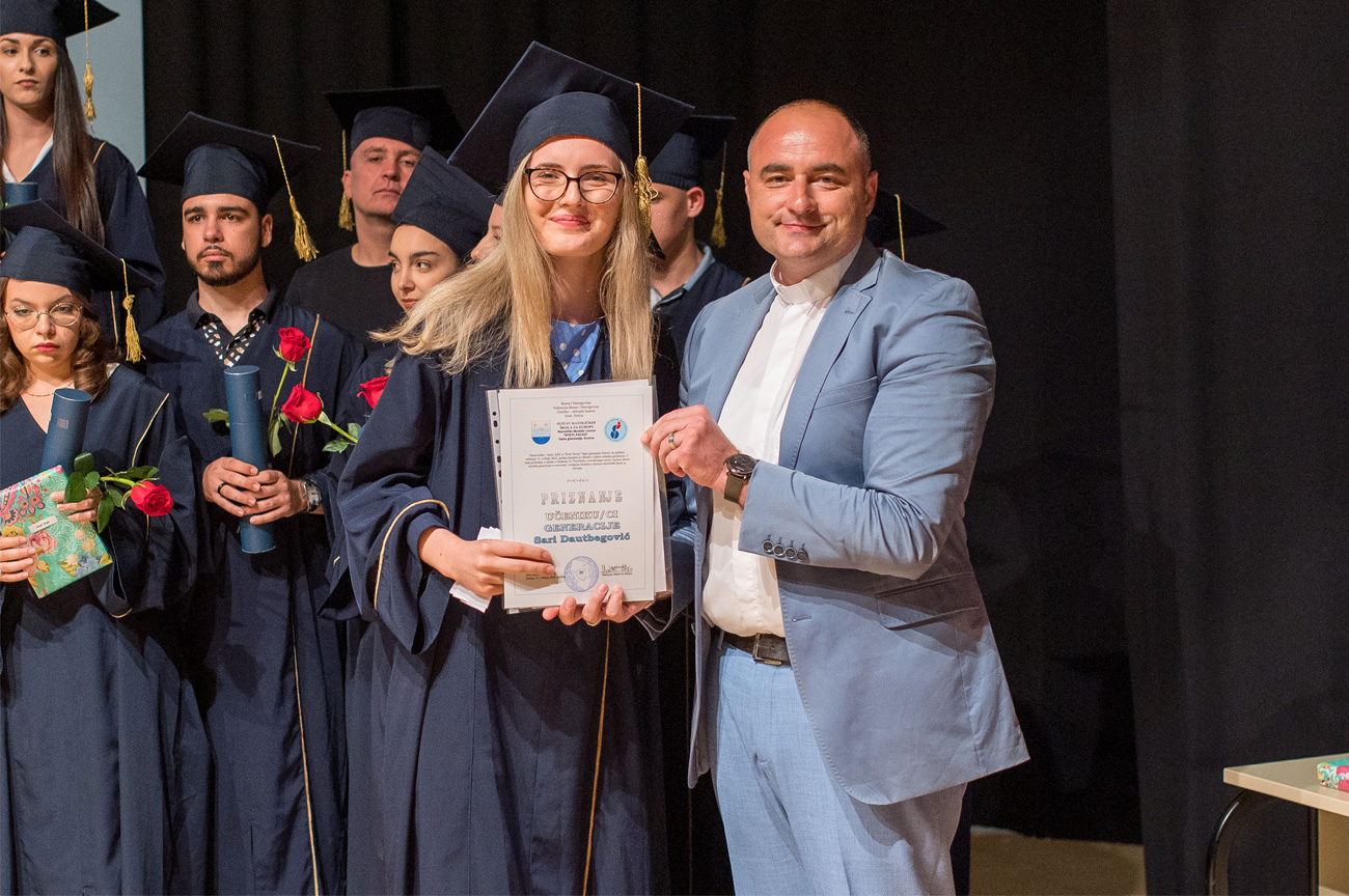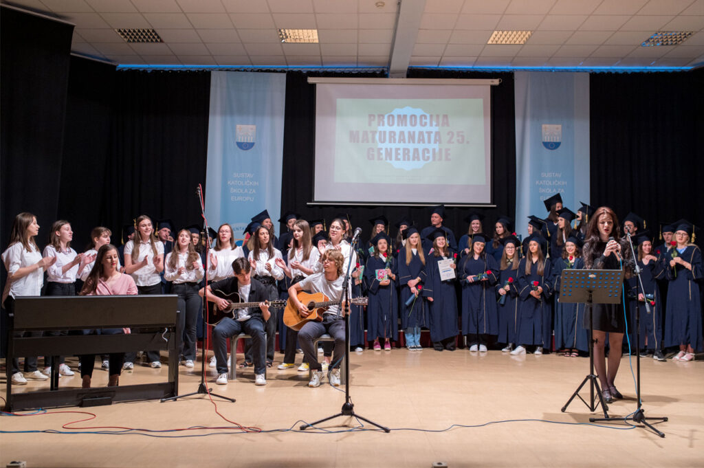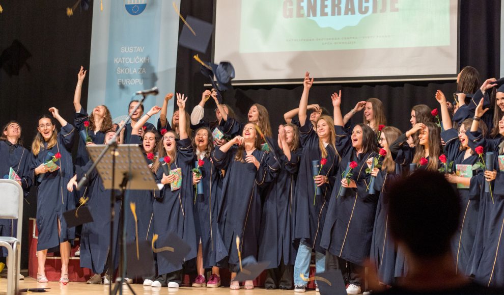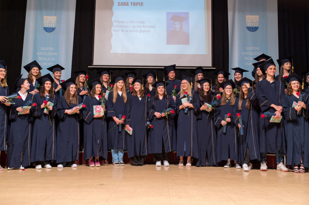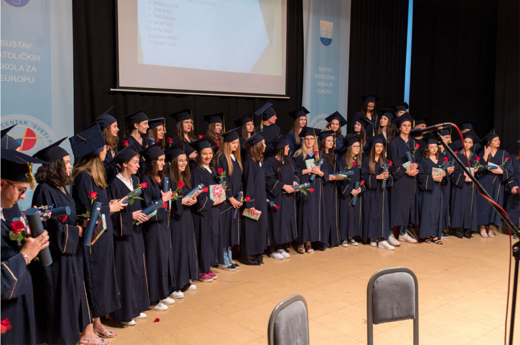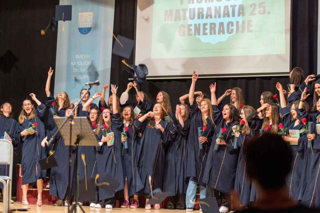 Dana 17.6.2022. godine u amfiteatru našeg Centra upriličili smo svečanu ceremoniju dodjele diploma XXV. generaciji maturanata naše Gimnazije. Promociji su prisustvovali nakon dvije godine osim maturanata i profesora, i roditelji i ostali gosti. Ovom prigodom najuspješnijim maturantima uručili smo posebne nagrade, a naš ravnatelj vlč. Vlatko Rosić uručio je dva priznanja „Učenica s posebnim priznanjem“ Tajana Salkić, IV.a i Ajla Ahmetović, IV.b, i priznanje „Učenica generacije“ Sara Dautbegović, IV.b. Svim našim maturantima želimo puno uspjeha u daljnjem školovanju i u svijetu odraslih!
