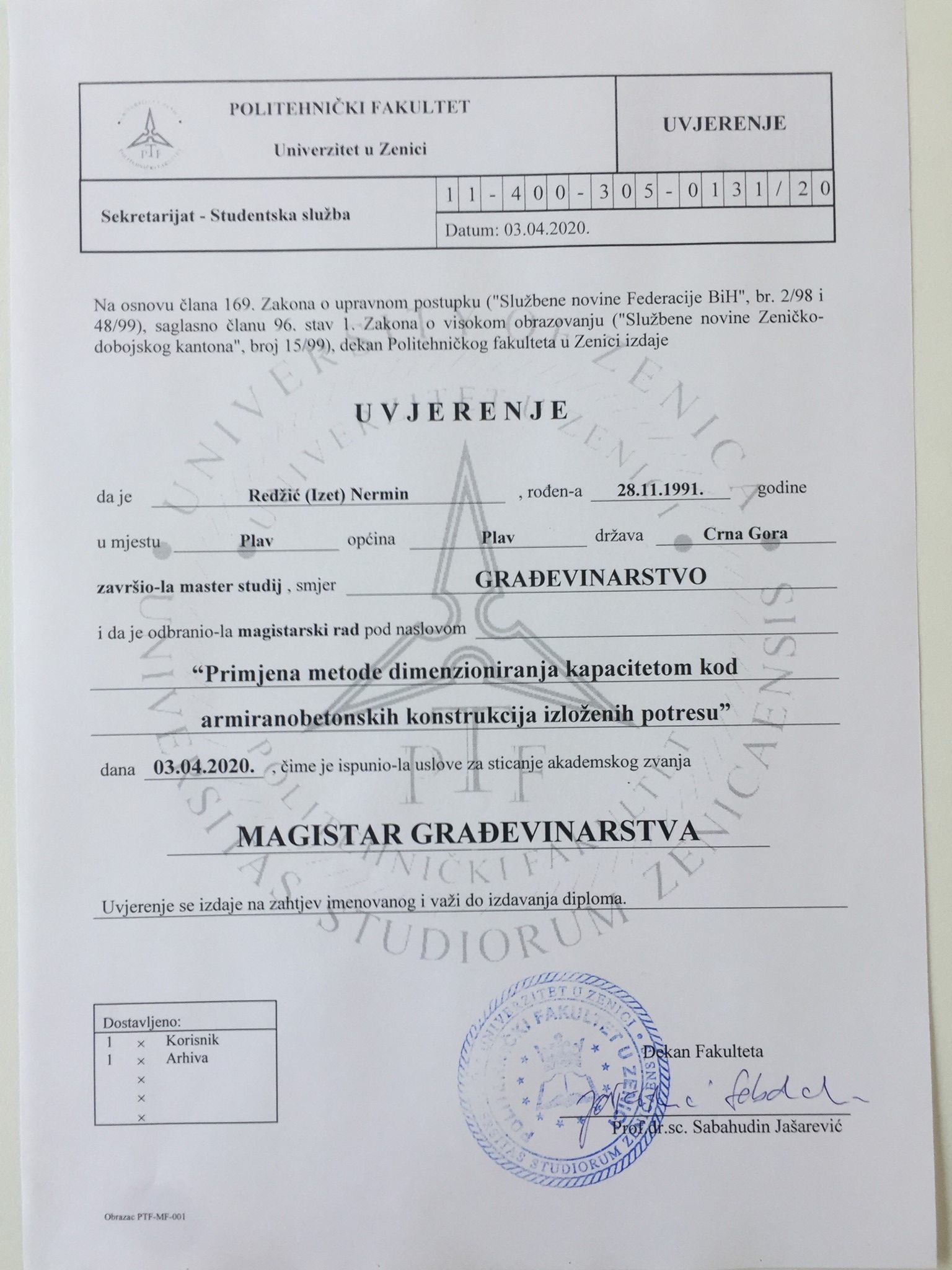 Kako je Zenicablogu potvrdio dekan Politehničkog fakulteta Univerziteta Zenica (UNZE) prof. Sabahudin Jašarević, Zeničanin Nermin Redžić prva je osoba koja je svoj magistarski rad odbranila putem video linka na ovom fakultetu, a vrlo vjerovatno i na cijelom Univerzitetu u Zenici.