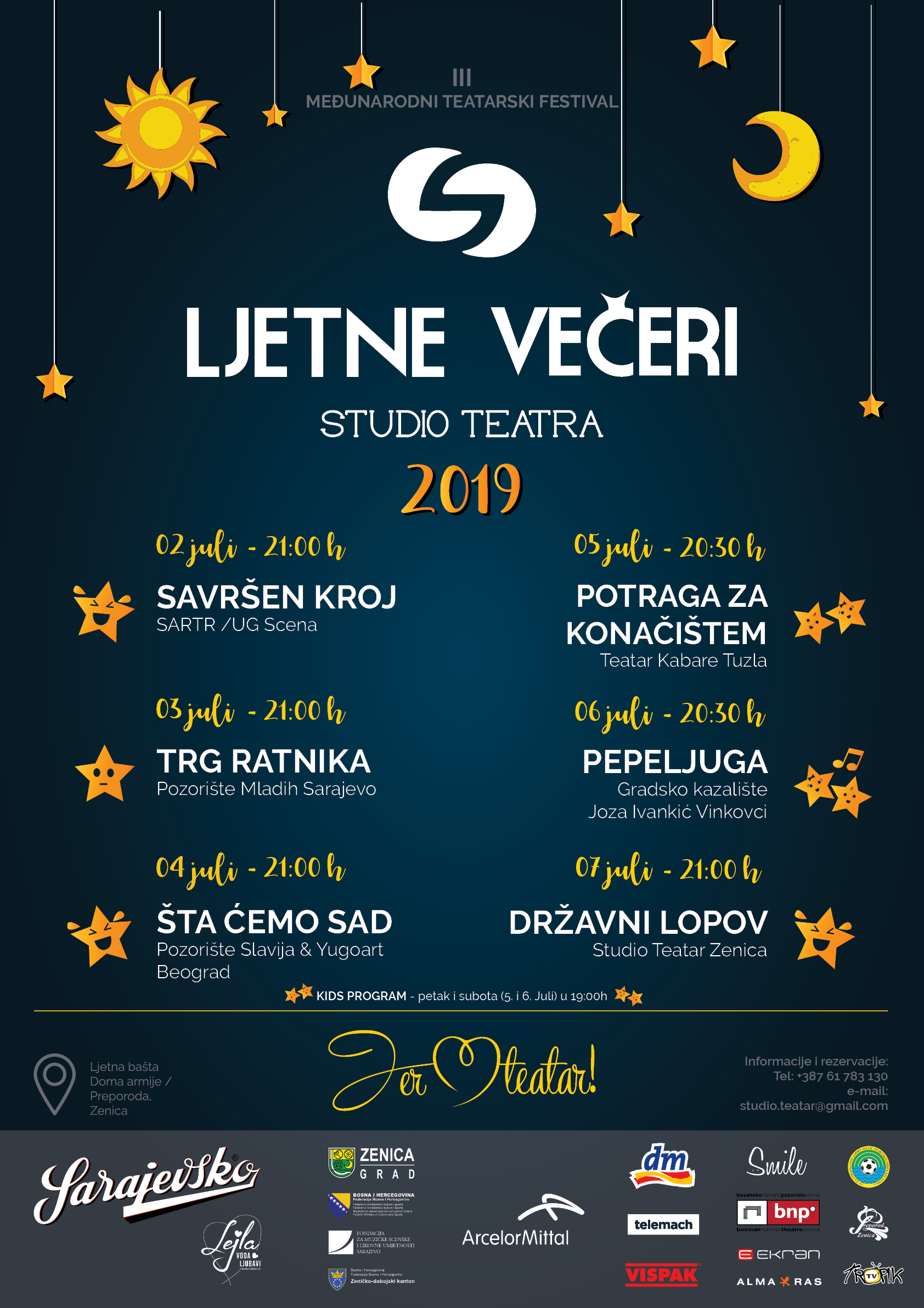 U nedjelju, 07. jula festival zatvara predstava „Državni lopov“, hit komedija, koja 15 godina nasmijava publiku, a svrstava se među najigranije živuće predstave u BiH. U predstavi Studio Teatra igraju Nusmir Muharemović, Irfan Kasumović i Mirza Mušija.
