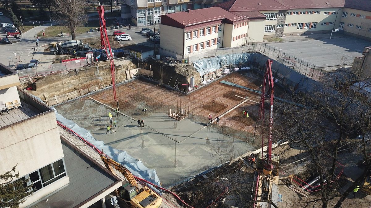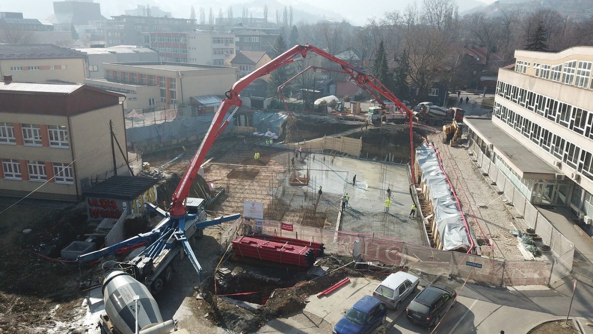 Danas se izvode radovi na betoniranju temeljne AB ploče, a planirano je da isti budu završeni do kraja dana.