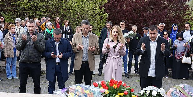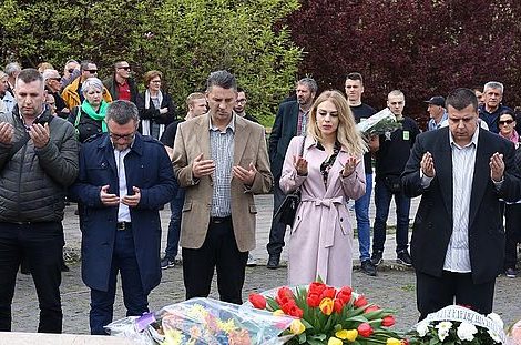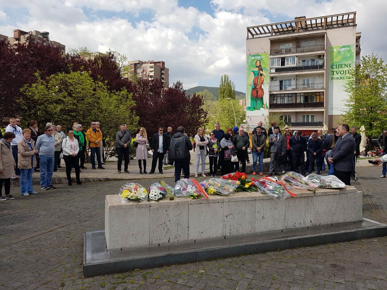 FOTO: Obilježen dan civilnih žrtava i sjećanja na zločin na Trgu – Polaganjem cvijeća i odavanjem počasti na Spomen-obilježju Kameni spavač obilježen je 19. april Dan civilnih žrtava rata grada Zenica.