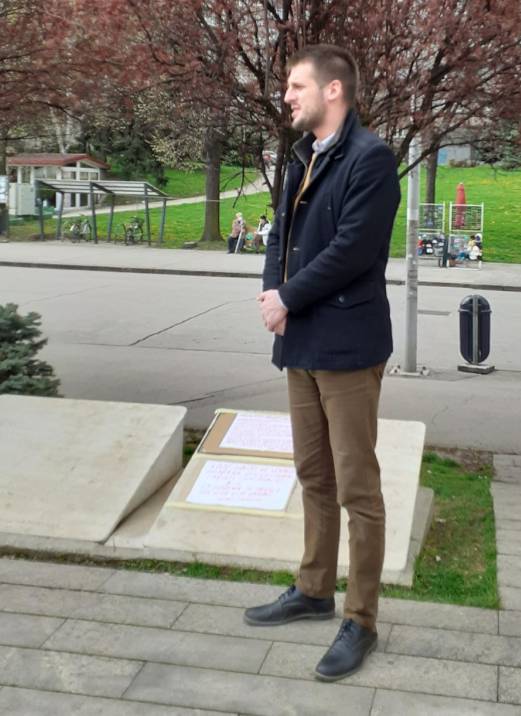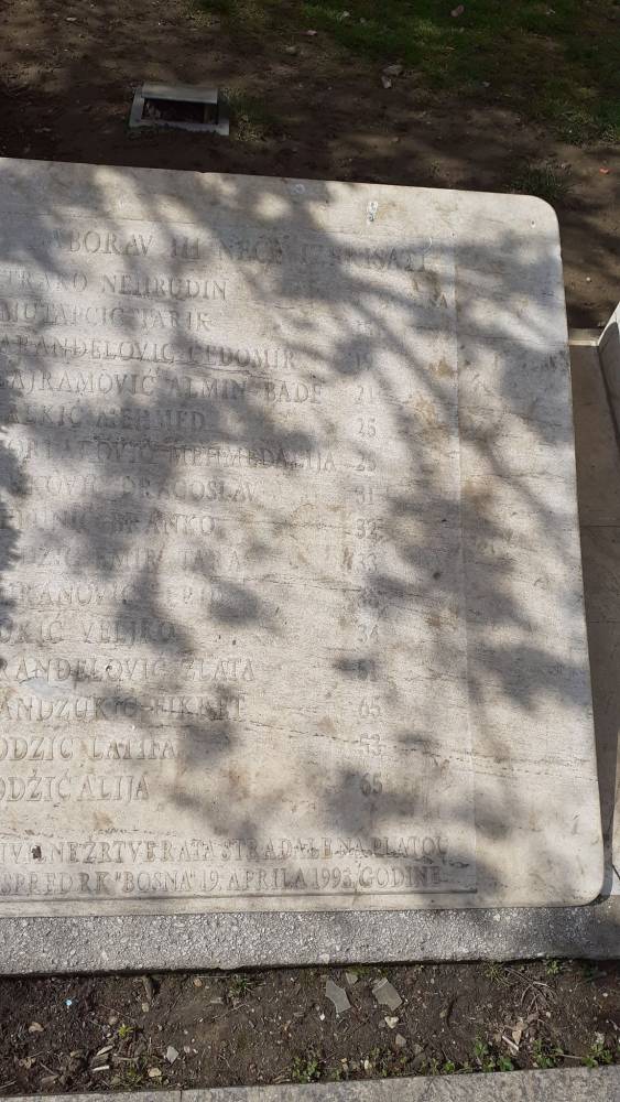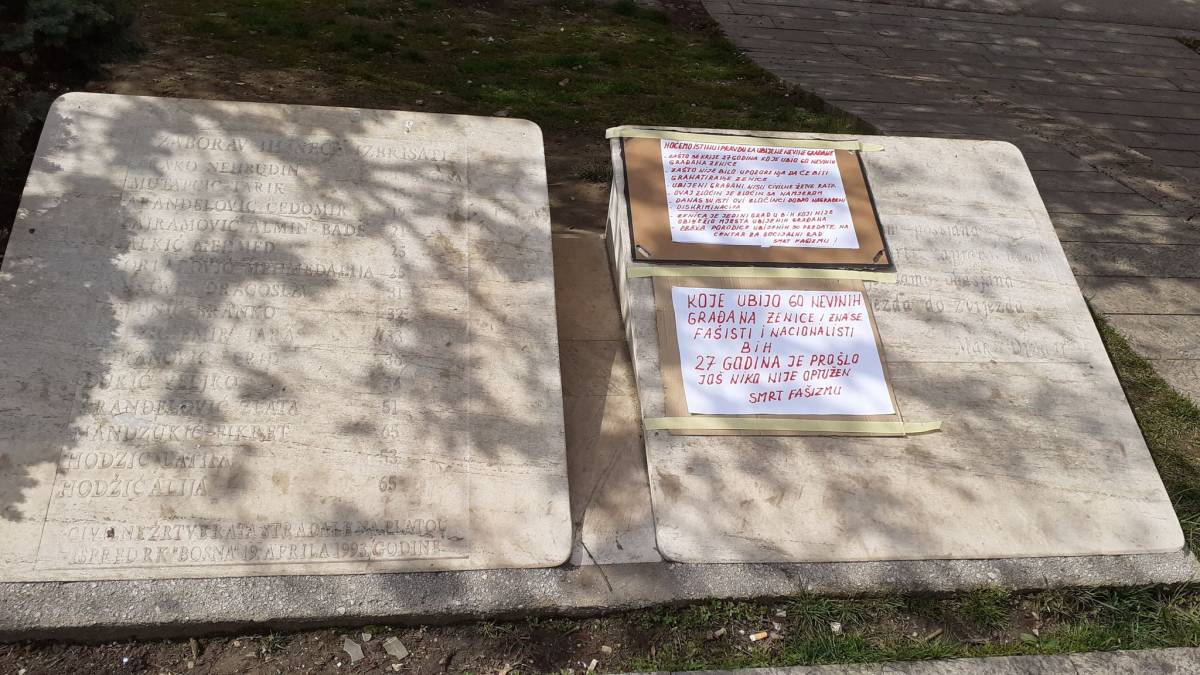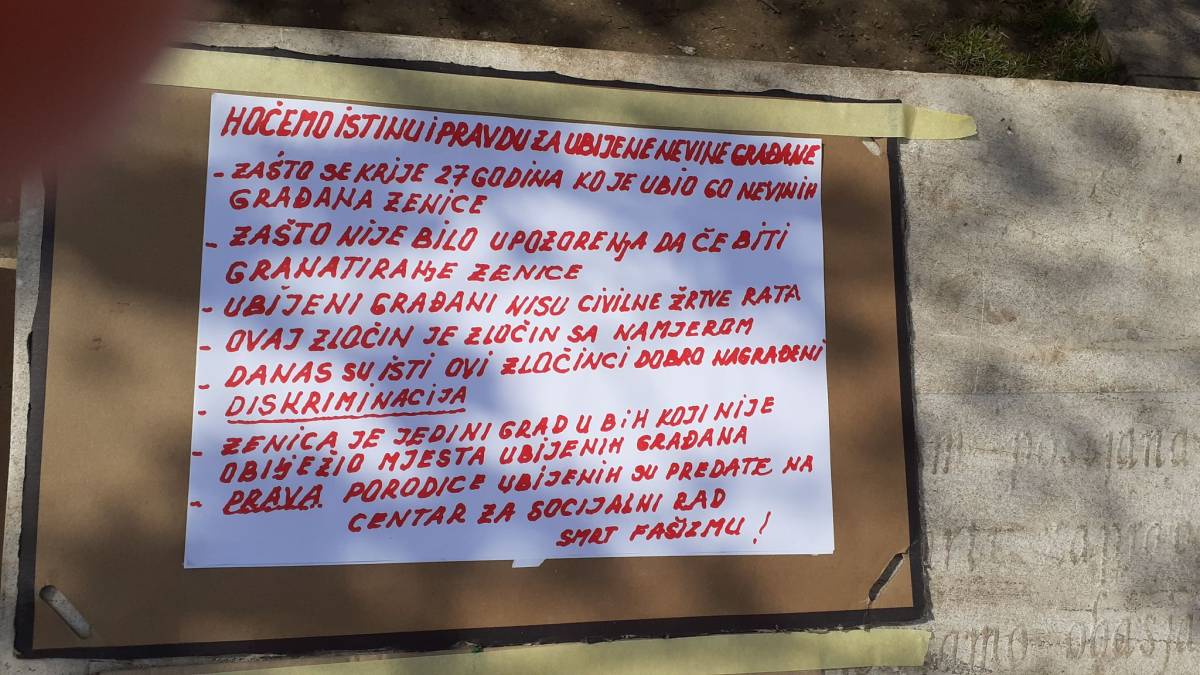 Na jednom dijelu spomenika zatičemo dvije zalijepljene poruke sa tekstovima pisane ručno, koje vam prikazujemo u foto galeriji. Prije početka ove manifestacije jedan od roditelja, koji je izgubio dijete u ovom masakru, pokazao nam je dvodjelni spomenik civilnim žrtvama  koji je u očajnom stanju i čija su slova sa imenima žrtava i kratkim tekstom u vezi masakra izlizana, da se gotovo ništa i ne može pročitati o čemu se radi. Kaže, da po spomeniku djeca trčkaraju, a spomenik je postavljen pod uglom od 15-20 stepeni. On predlaže da se spomenik postavi okomito i da se slova obnove, jer je zub vremena učinio svoje. Evo prijedloga za gradsko vijeće da se ovo popravi i trajno obilježi i da se nikad i nikom ne dogodi.