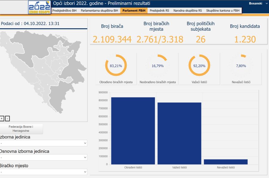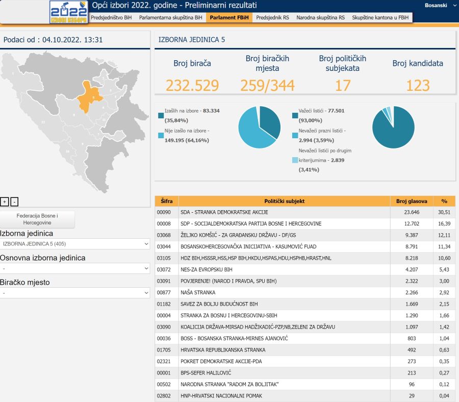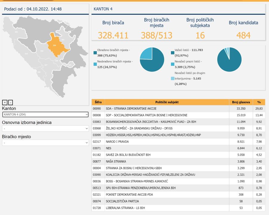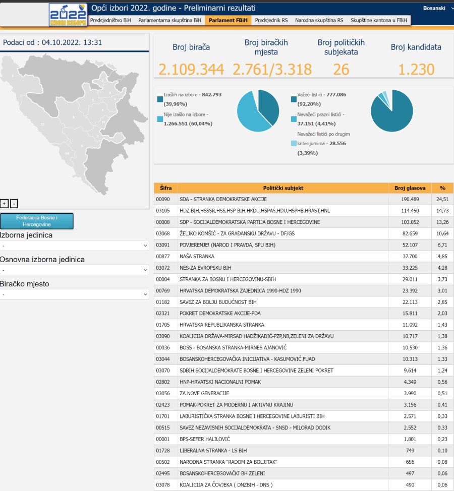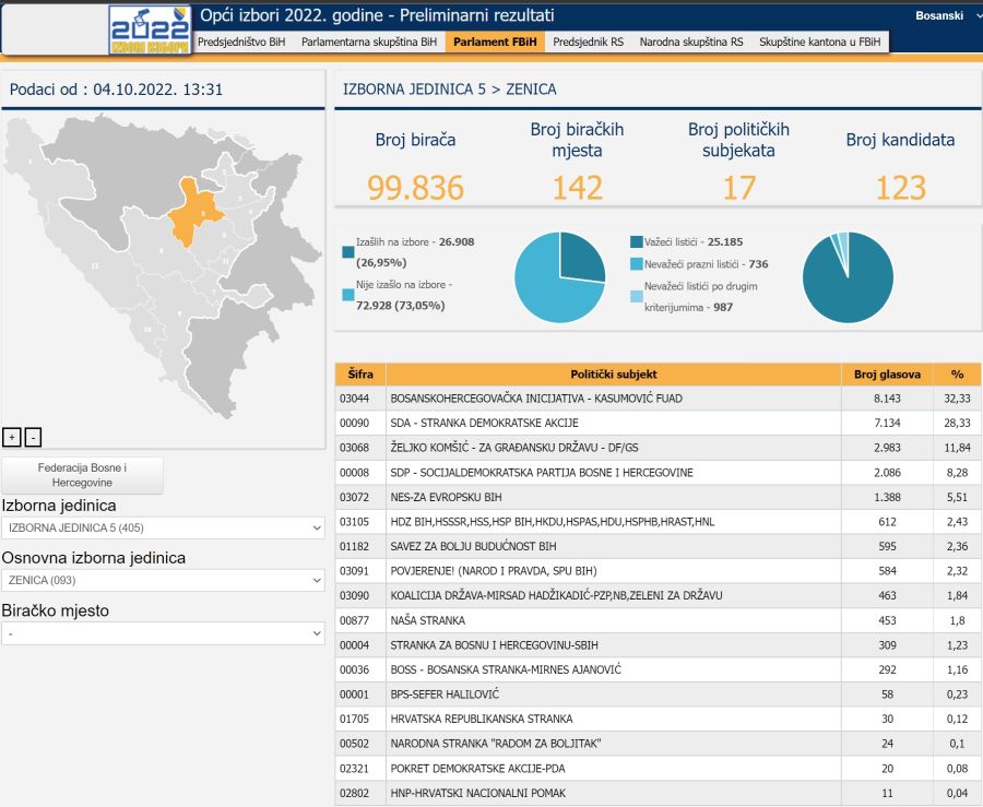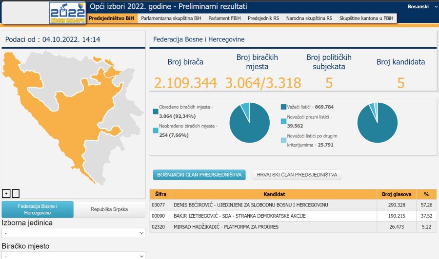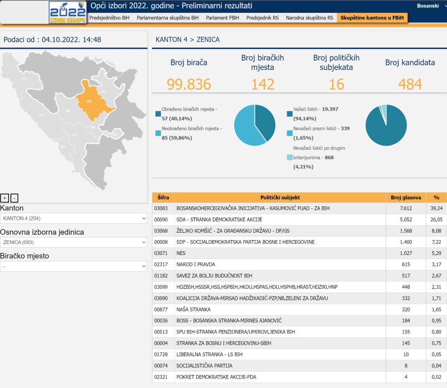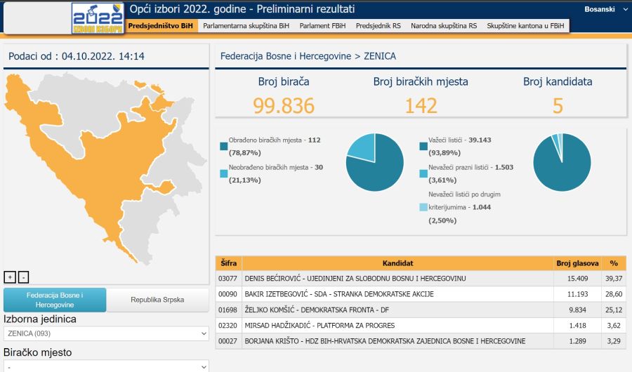 Centralna izborna komisija BIH je drugog dana nakon izbora, utorak, nešto prije 15 sati objavila ažurirane liste za Predsjedništvo BIH, Parlamente BiH i FBIH, te Skupštinu ZDK. pogledajte rezultate za Zenicu, ZDK i zbirno sve rezultate.