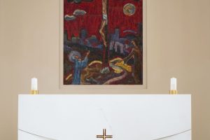 U čisti hram uzvišene svečanosti likovni umjetnici unijeli su boju i ritam kojima je prostor otvoren čovjeku. Mozaik Golgota (Blaženka Salavarda) oživljava središnji dio crkve te vezom pojedinih kamenčića u živu cjelinu slike potiču na komunikaciju pojedinca i zajednice. Medaljon na krstionici Krštenja na Jordanu (Mile Blažević), snagom izričaja upućuje na otajstvenost obreda krštenja.