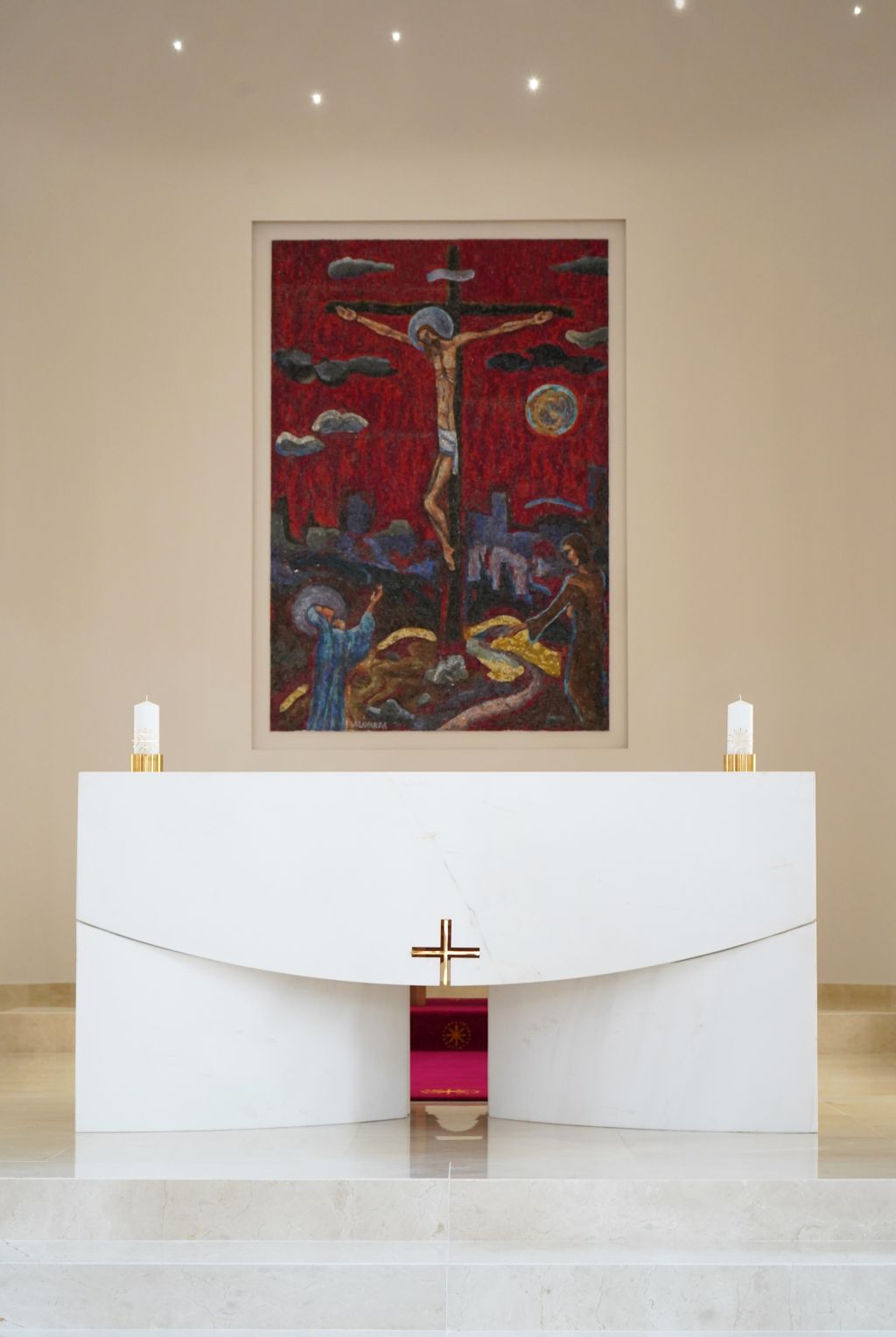U čisti hram uzvišene svečanosti likovni umjetnici unijeli su boju i ritam kojima je prostor otvoren čovjeku. Mozaik Golgota (Blaženka Salavarda) oživljava središnji dio crkve te vezom pojedinih kamenčića u živu cjelinu slike potiču na komunikaciju pojedinca i zajednice. Medaljon na krstionici Krštenja na Jordanu (Mile Blažević), snagom izričaja upućuje na otajstvenost obreda krštenja.
