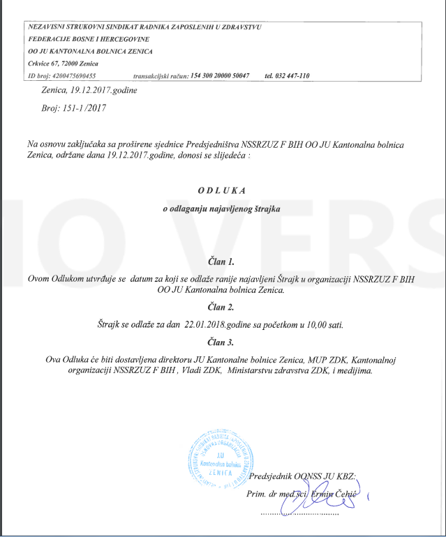 FOTO: Odluka o odgađanju štrajka u KBZ – Nezavisni strukovni sindikat radnika zaposlenih u zdravstvu FBiH je na proširenoj sjednici Predsjedništva odlučilo da se donese odluka u odlagaju najavljenog štrajka. Štrajk je odgođen za 22.01.2018. godine sa početkom u 10,00 sati. Cijelu odluku pogledajte u prilogu: