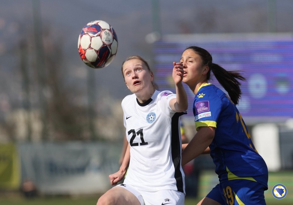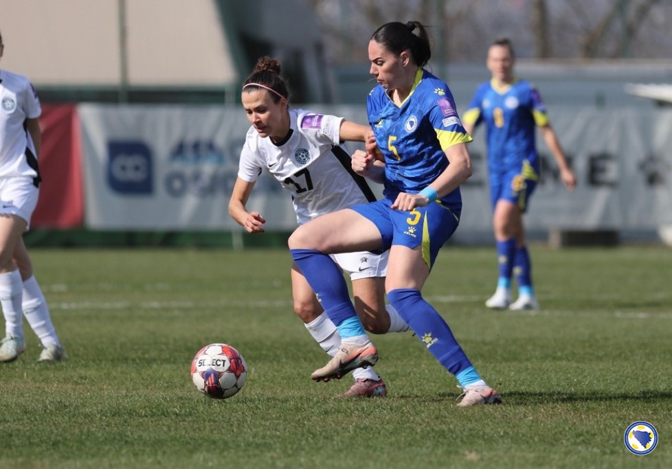 U prvom poluvremenu terensku inicijativu imao je bh. tim, a prva prilika je promašena u 15′ kad Sofija Krajšumović šutira iskosa sa desne strane, međutim golmanica Katarina Kapa izbacuje loptu u korner. Pet minuta poslije nakon jednog kornera stvorila se gužva u kaznenom prostoru Estonije i lopta dolazi do Melise Hasanbegović koja šutira sa desetak metara, ali Kapa još jednom dobro interveniše. Estonke su prvu priliku imale nakon kontra napada u 27′, Mari-Liis Lillemae je pokušala iz povoljne pozicije, a Ena Šabanagić je izblokirala njen udarac.