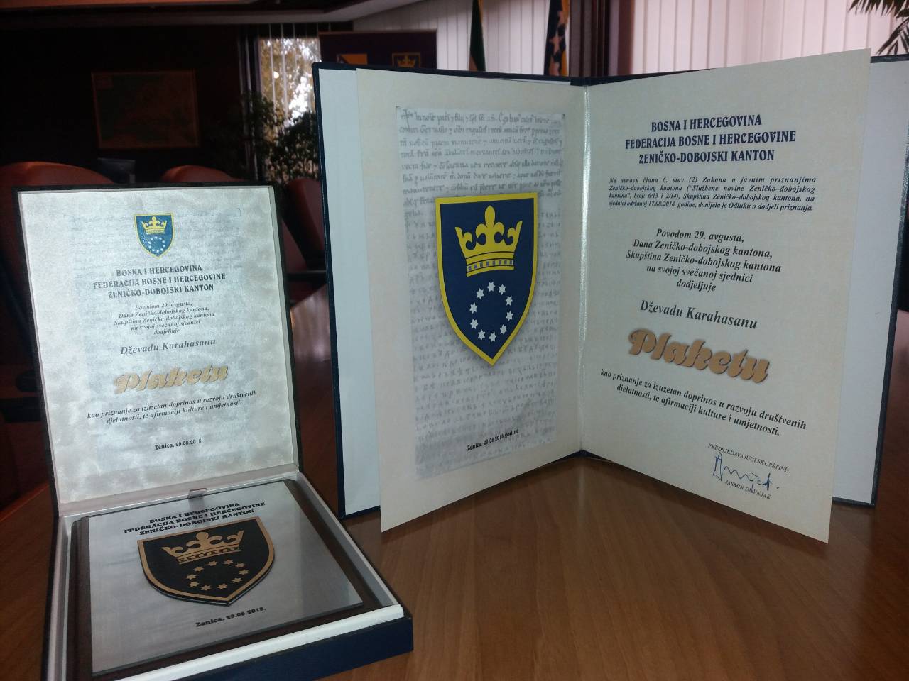 Uručenje Plakete je uslijedilo iz razloga što laureat, uvaženi bosanskohercegovački književnik, dramatičar, esejist, romanopisac, akademik Dževad Karahasan nije bio u mogućnosti prisustvovati dodjeli javnih priznanja Zeničko – dobojskog kantona, na dan 29. august 2018. godine kada je upriličena Svečana sjednica Skupštine Zeničko-dobojskog kantona u povodu Dana Zeničko-dobojskog kantona i Povelje Kulina bana na kojoj su laureatima – u svečanom činu – javna priznanja i dodijeljena.
