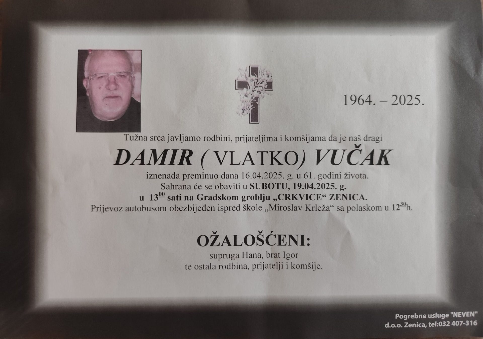 Damir Vučak je preminuo 16. aprila 2025. godine u 61. godini života, a vijest o njegovoj smrti duboko je potresla mnogobrojne Zeničane, prijatelje i poznanike ovog prepoznatljivog lica grada.