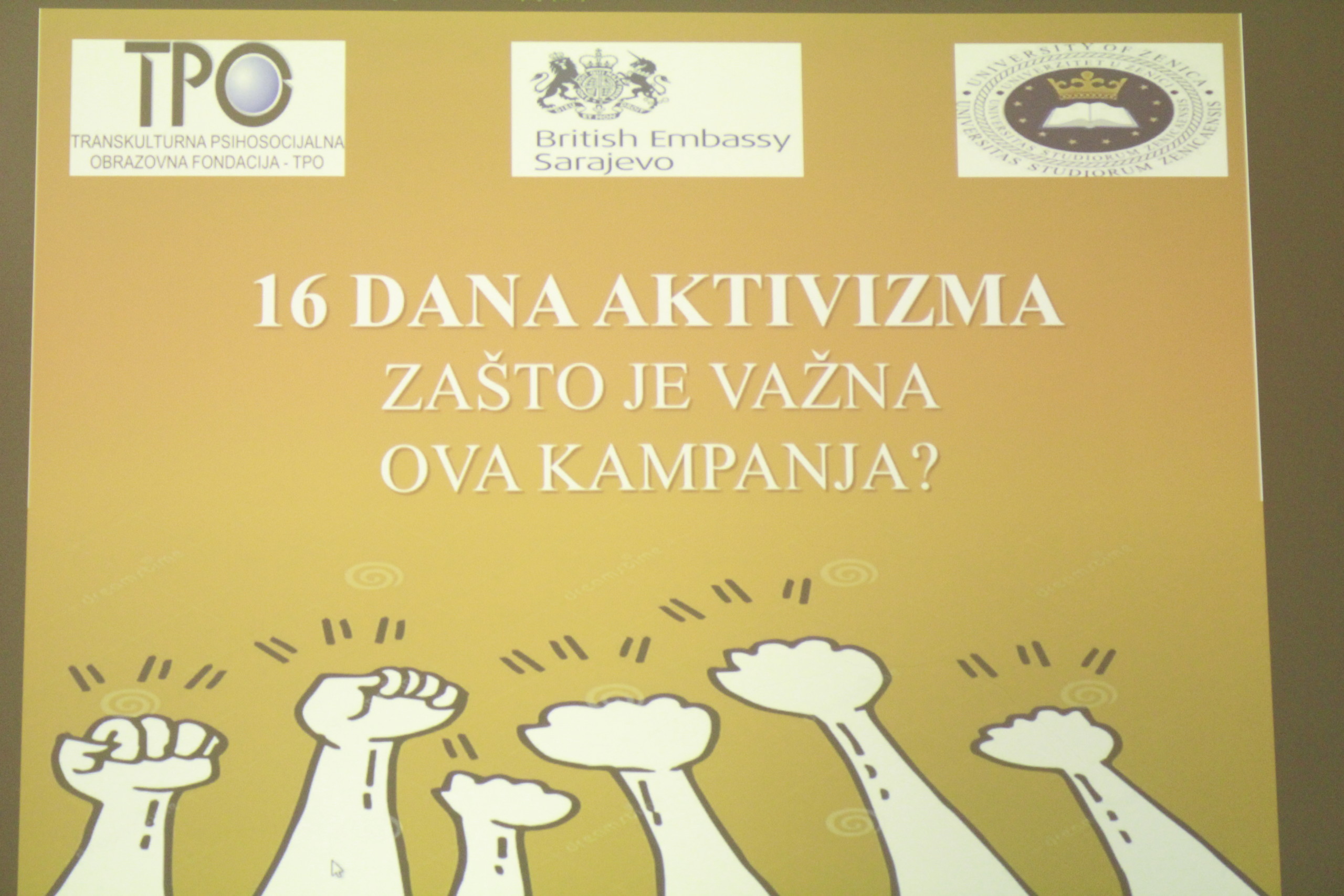 Nakon ovog predavanja, a u sklopu realizacije UNIGEM projekta, održana je radionica „16 dana aktivizma“. UNIGEM projekat se realizira u saradnji sa TPO fondacijom i Ambasadom Velike Britanije, te predstavlja stratešku opredjeljenost univerziteta za uvođenjem rodne perspektive, odnosno osiguranjem rodne ravnopravnosti i sigurnog ambijenta za nastavnike i nastavnice, kao i za studente i studentice na univerzitetima u Bosni i Hercegovini. U svrhu realizacije ovog projekta na Univerzitetu u Zenici formiran je Centar za rodnu ravnopravnost, a članovi Savjetodavnog odbora Centra prof.dr.sc. Maša Alijević i prof.dr.sc. Ilhan Bušatlić sa studentima su razgovarali u okviru radionice.
