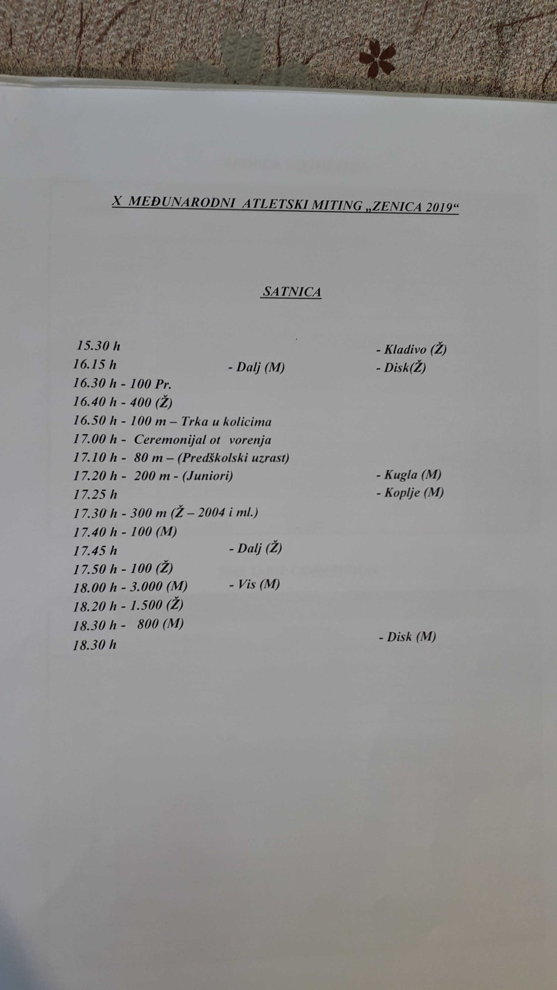 Miting će početi u 15,30 sati disciplinom kladivo za žene. Ceremonija svečanog otvaranja manifestacije je u 17 sati. Nakon toga u 17,25 na programu je bacanje kugle, dok je u 18,30 sati trka na 800 metara.
