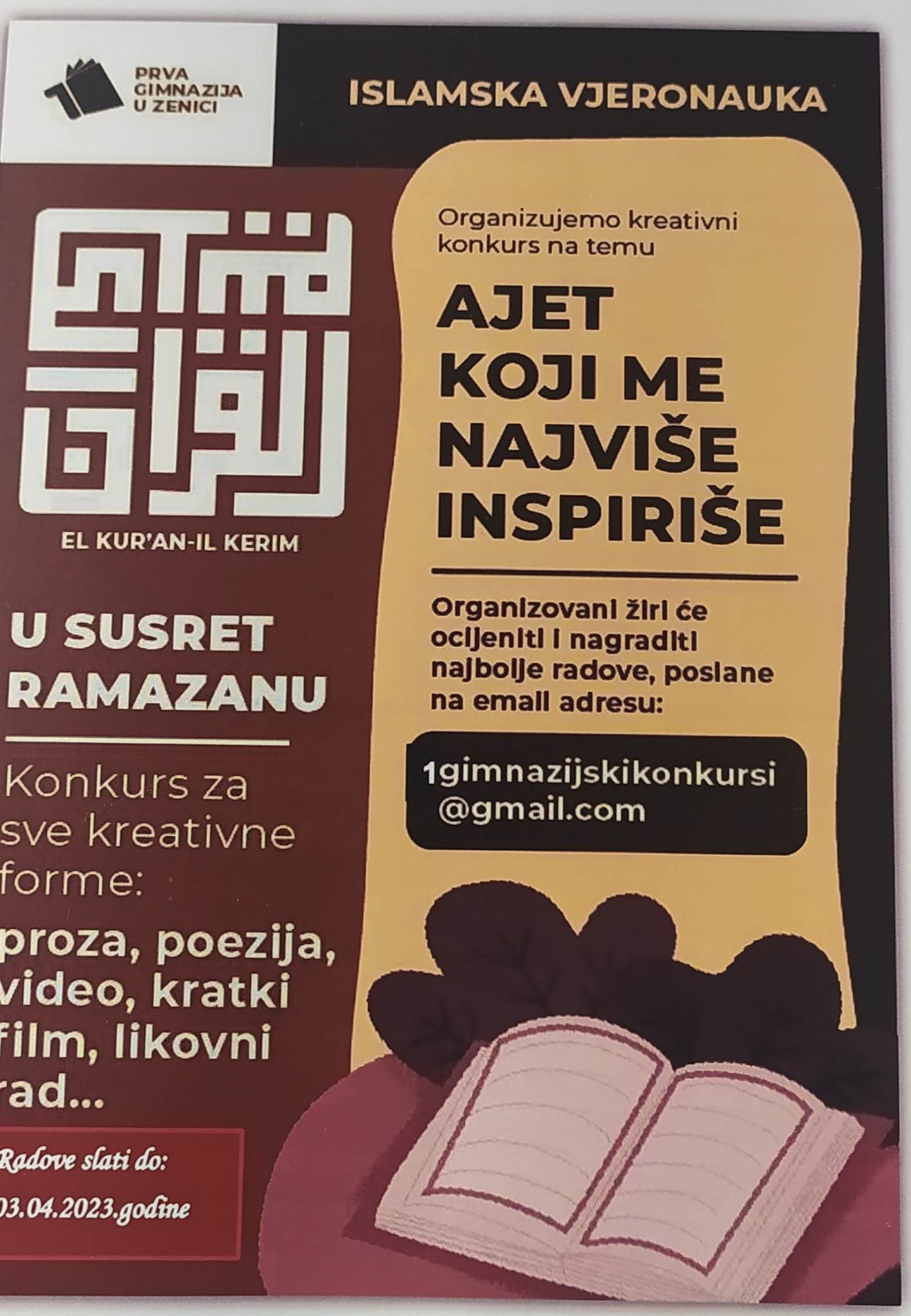 – Organizacija unutarškolskog konkursa na temu „Ajet koji me inspiriše“ koju su učenici mogli izraziti u formi koja im odgovara (literarni, likovni, foto ili video radovi)
